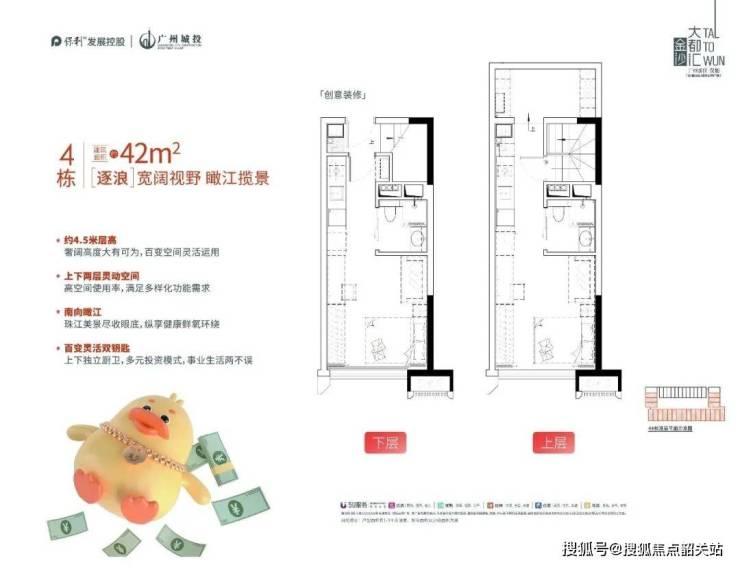 项目建面约30-42㎡,约4.5米高,属于产权房源,并且上下两层可独立入户,实行双钥匙管理,可实现自住,投资一步到位。